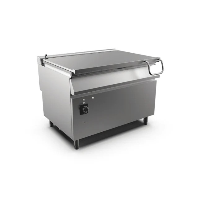 Build: Freestanding tilting electric bratt pan, AISI 304 stainless, flush-mount ready (seal), adjustable stainless feet, IPX5.
